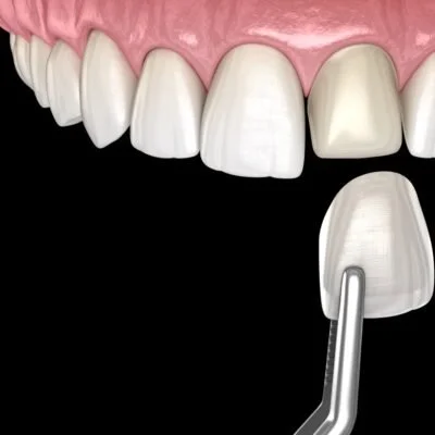 Thin porcelain shells individually crafted to cover the front surface of existing teeth to improve the color, shape, size, as well as alignment of these teeth and enhance aesthetic appearance of the individual’s smile.